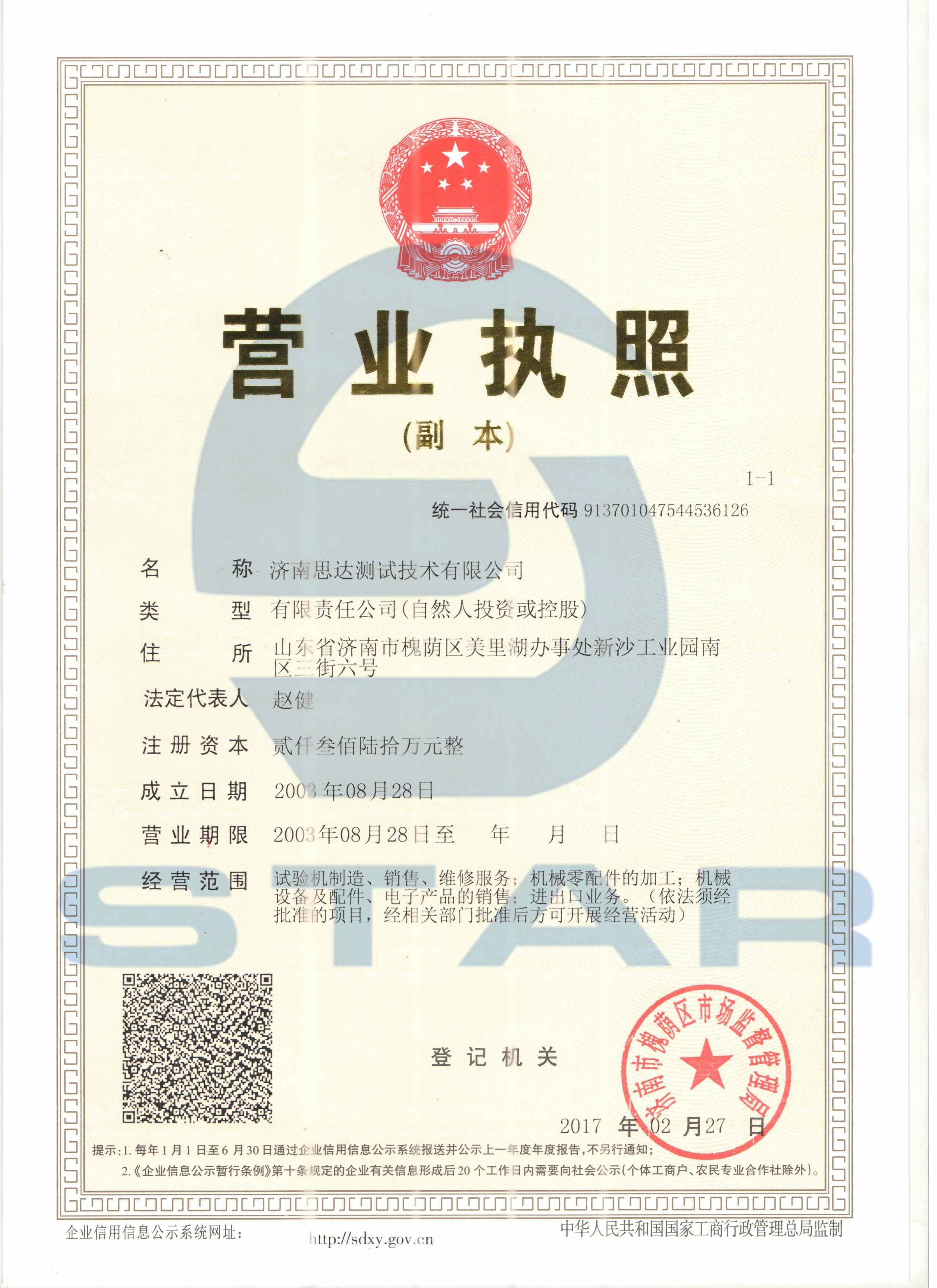 濟南思達營業額變為:貳仟叁佰陸拾萬元整,地址變更為:山東省濟南市槐蔭區美里湖辦事處新沙工業園南區三街六號。歡迎廣大新老顧客光臨惠顧,我們將竭誠為您服務!